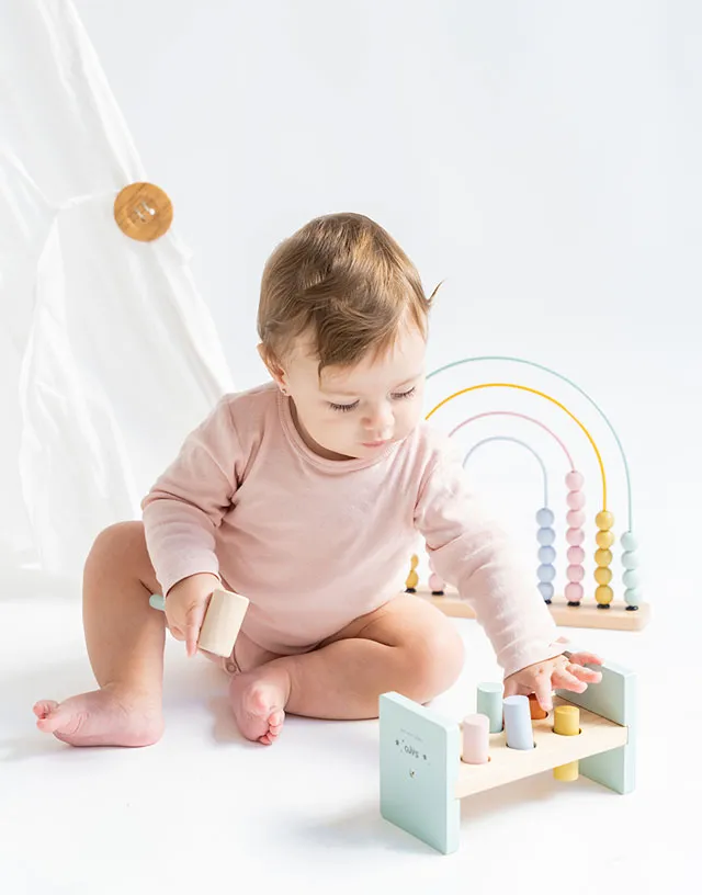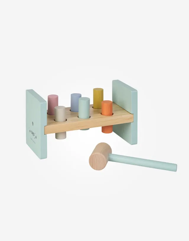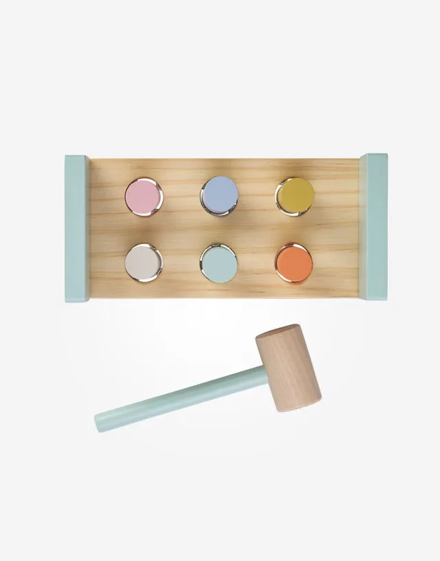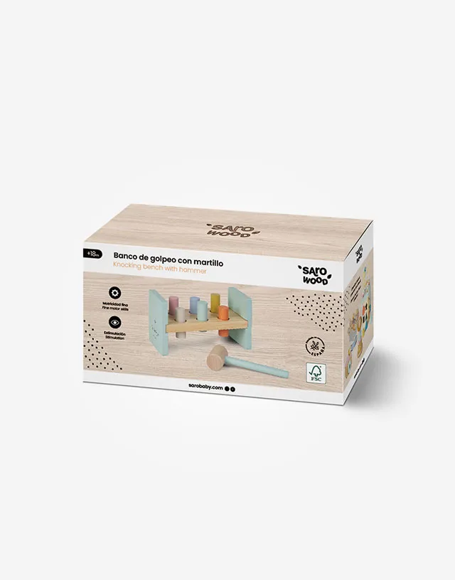 ¡Pum! ¡Pum! Este divertido banco, se convertirá en el juguete favorito de tu peque. Seis cilindros de colores listos para ser golpeados con un martillo de madera.