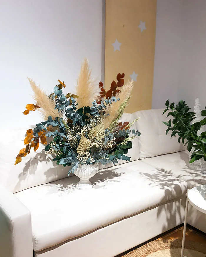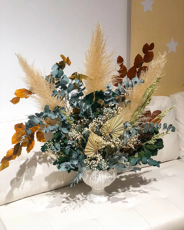 Las hojas y flores en tonos neutros elevan la elegancia del conjunto, añadiendo un toque sofisticado que refleja el buen gusto. 🍃💫 Pero aquí viene lo especial, unas pampas colocadas como un abanico bohemio que aporta ese toque desenfadado y auténtico que tan en tendencia está este año.