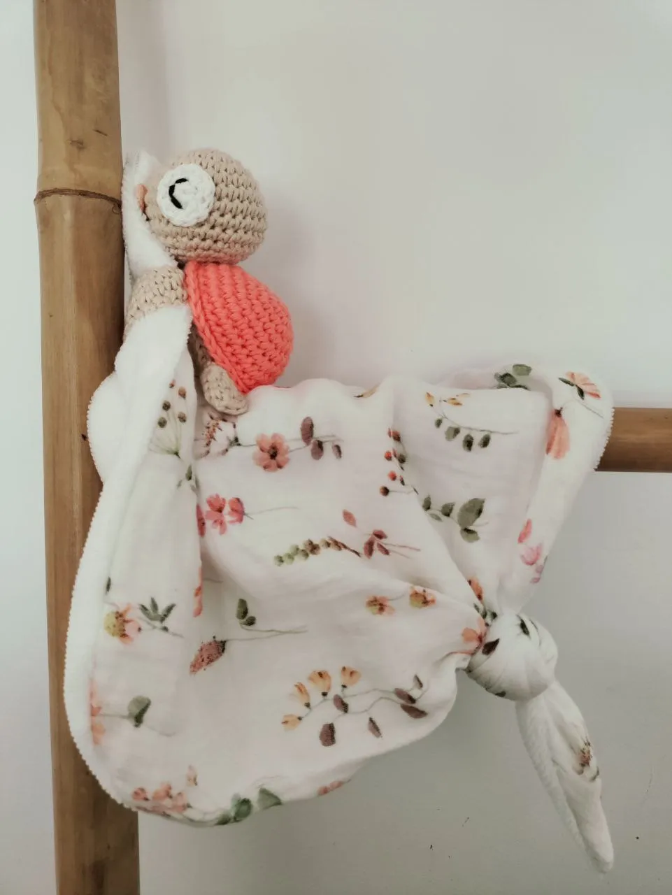 Es totalmente artesanal y su creación lleva muchísimo cariño, algodón de primera calidad y relleno de floca certificada para muñecos, la parte del doudou es de algodón y bambú.