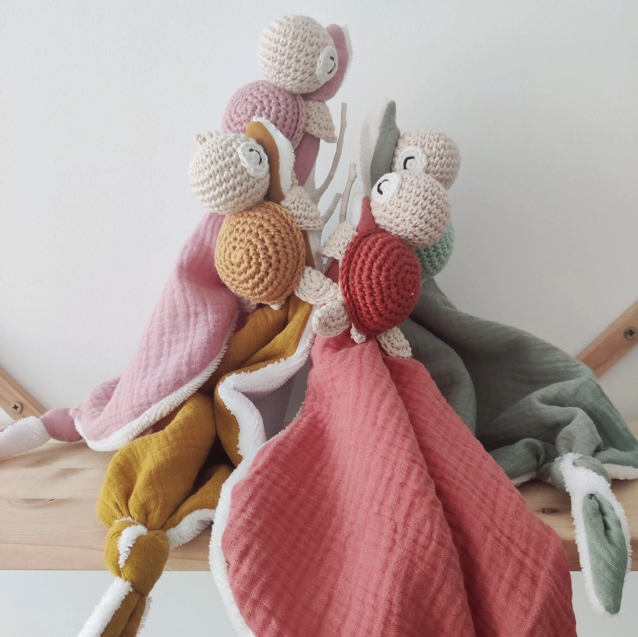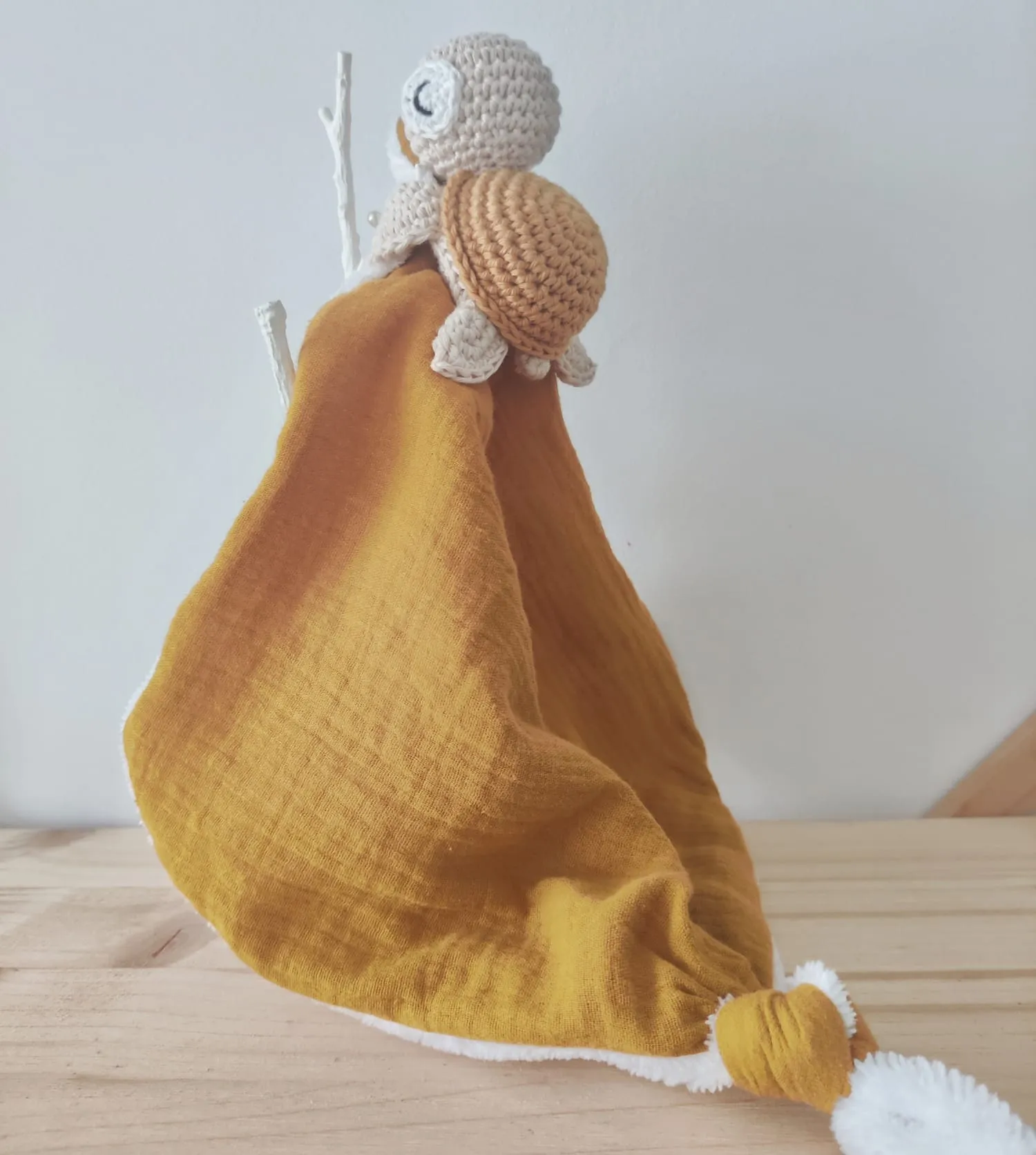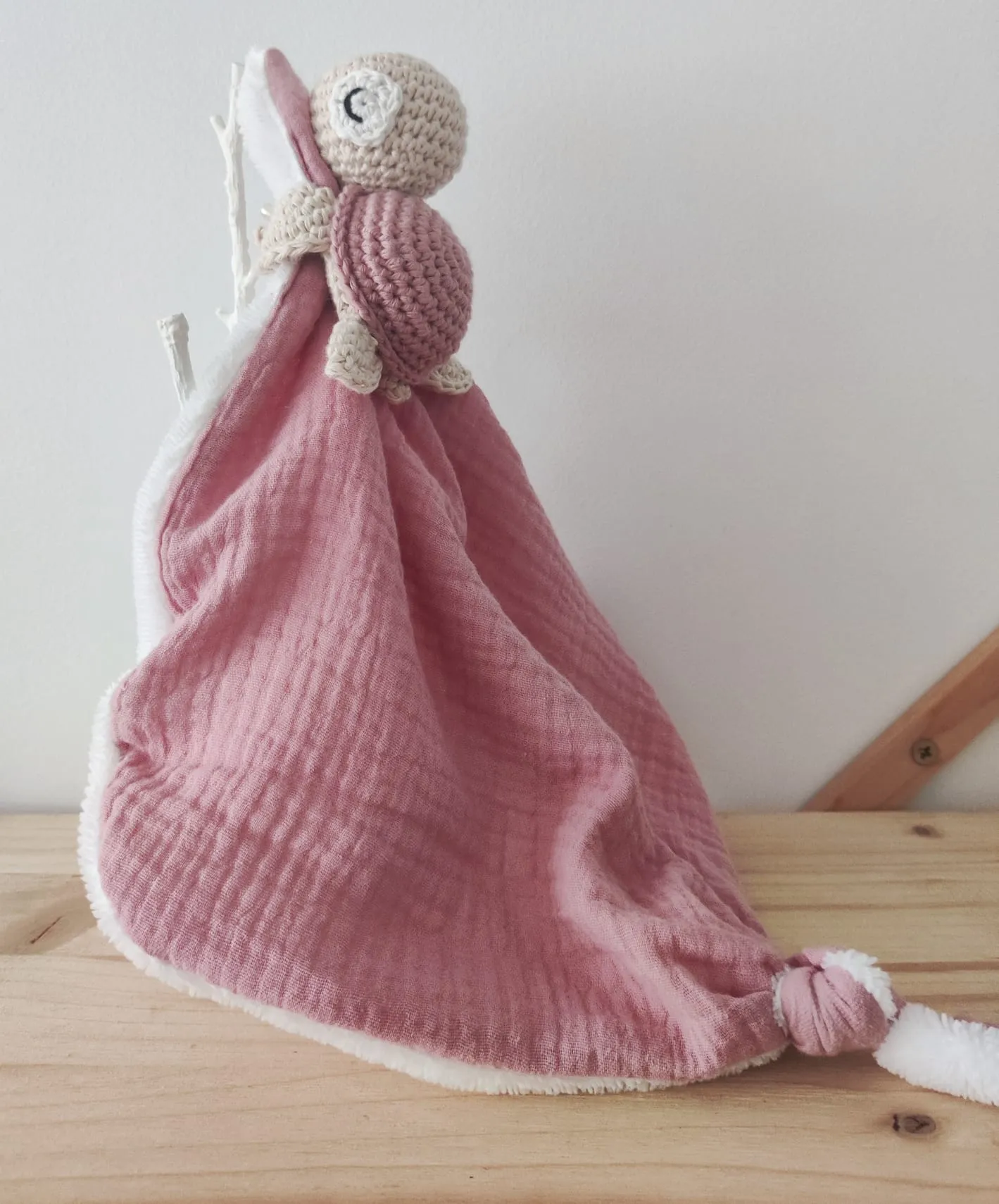 Es totalmente artesanal y su creación lleva muchísimo cariño, algodón de primera calidad y relleno de floca certificada para muñecos, la parte del doudou es de algodón y bambú.