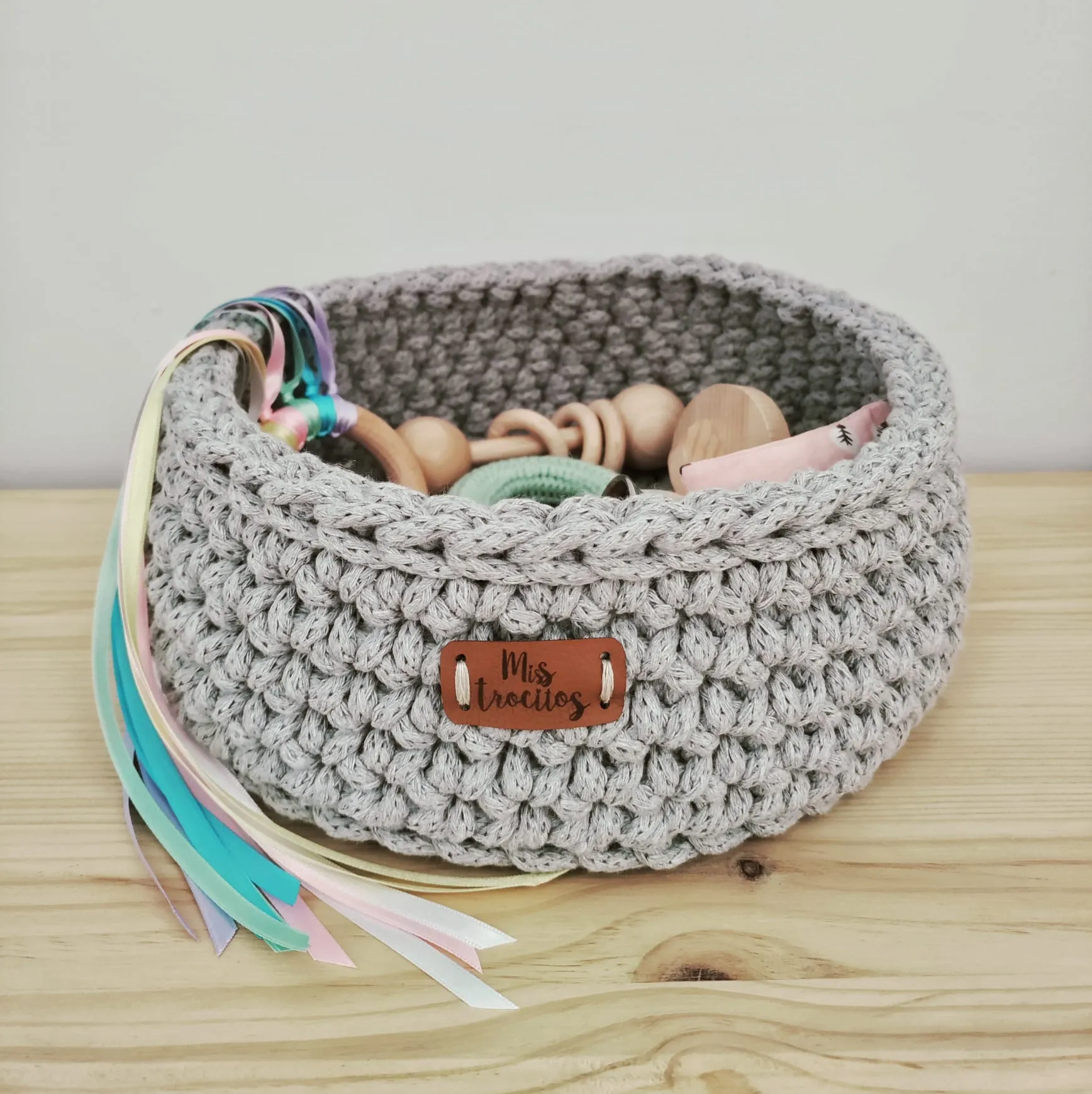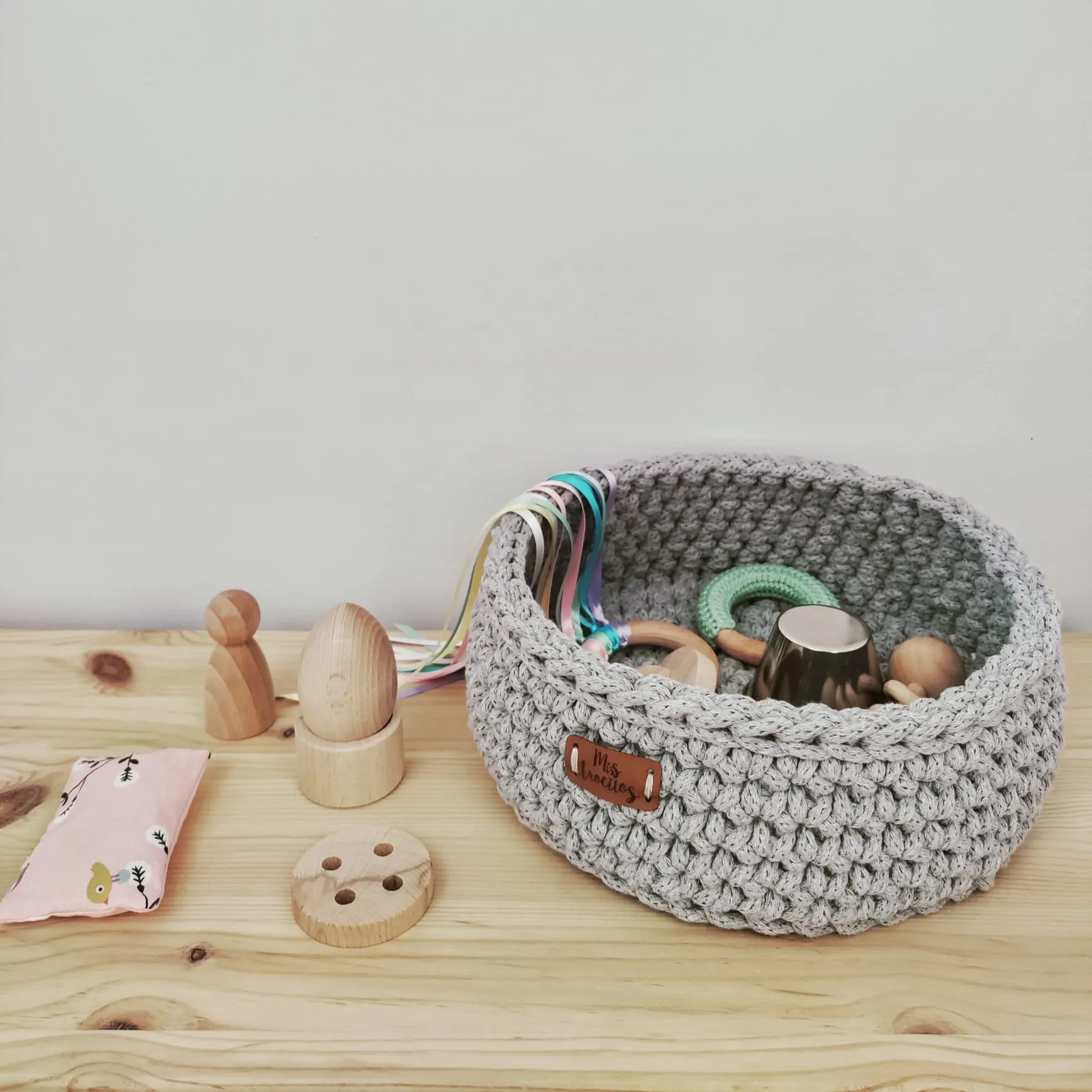 – 1 cesto de crochet de algodón 100% de 24 X 10 cm aproximadamente. *saquito sensorial puede variar el estampado según stock. *si hay falta de stock de algún material se cambiará por otro de igual valor o superior. |