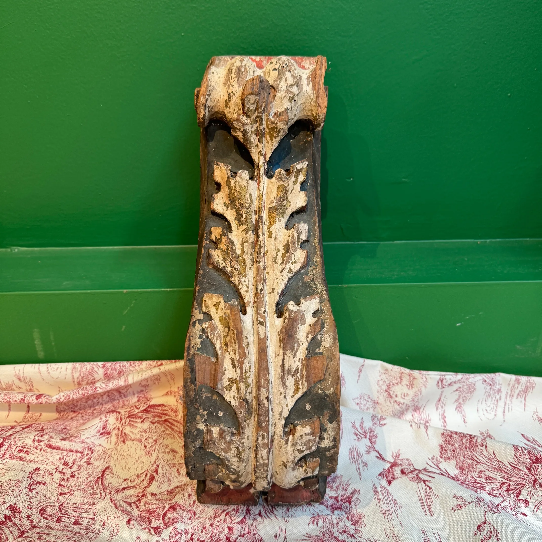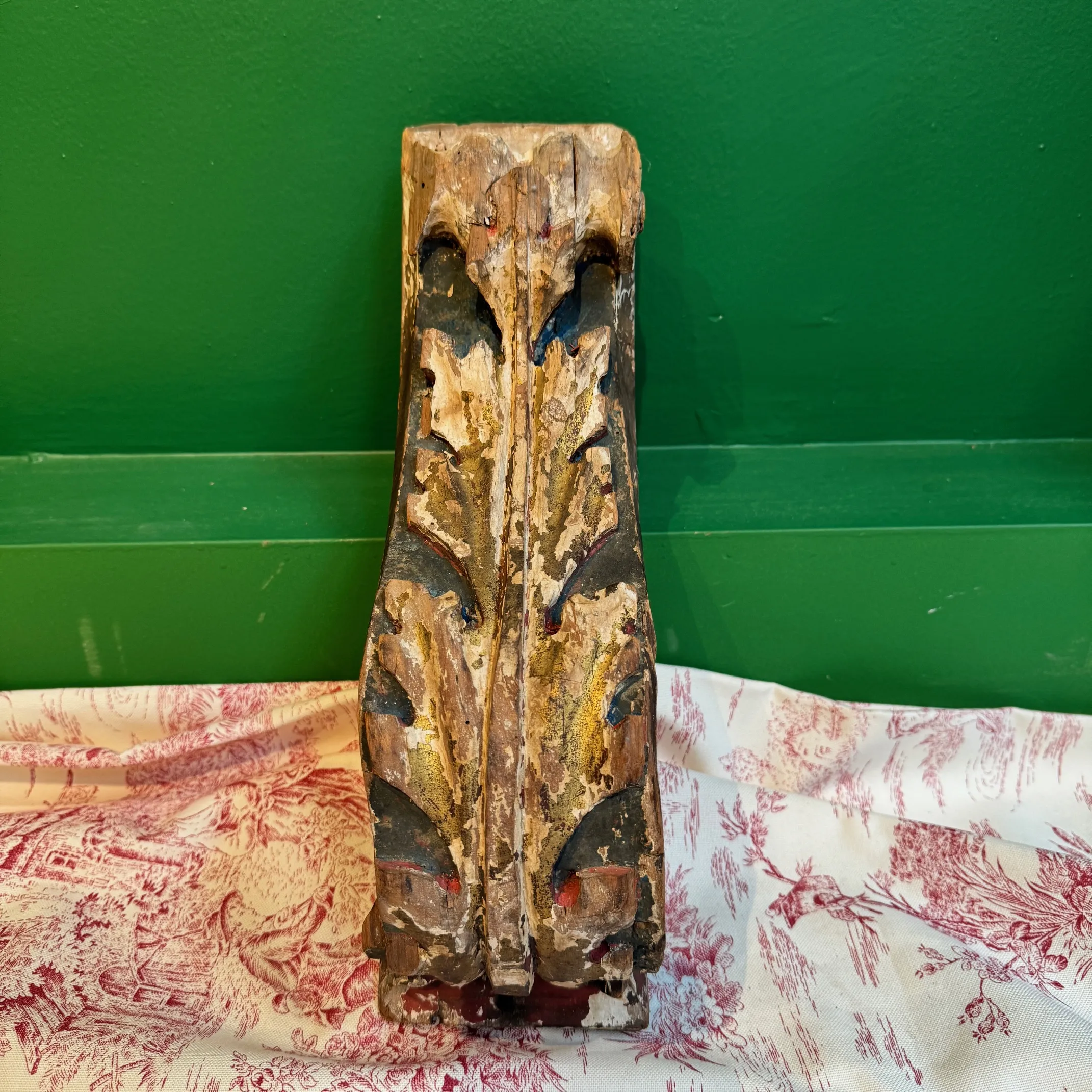 Preciosa ménsula antigua de madera tallada y policromada con una espectacular pátina original.